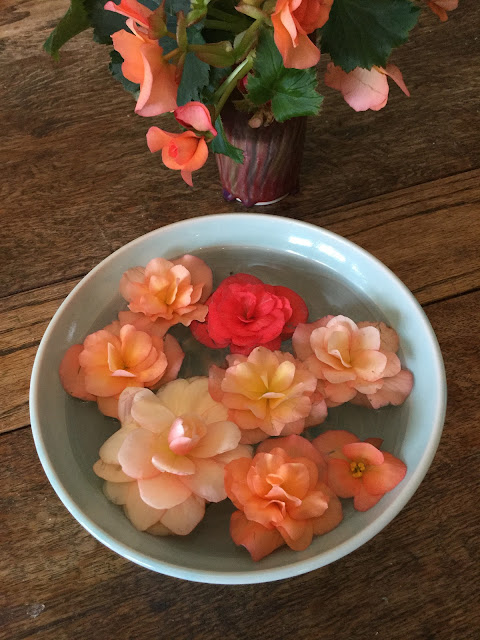 たくさん花びらとお花が落ちてしまったのでボウルに浮かべて見た。茎から折れてしまった部分もあってバスルームとキッチンに飾ったよ。